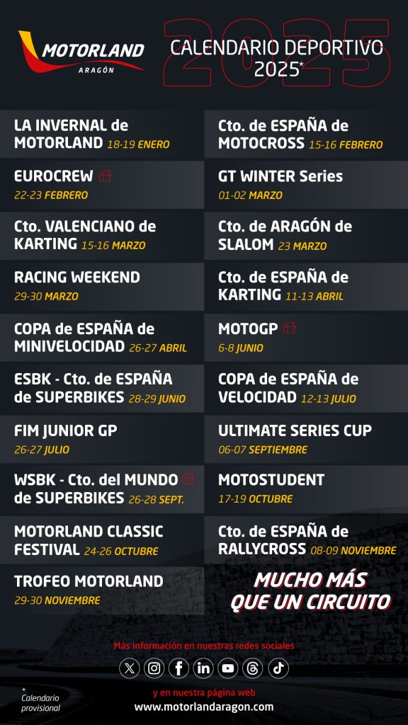Motorland cuenta con una gran cantidad de eventos de carácter mundial como por ejemplo World Series, el Mundial de MotoGP o el FIM Superbike World.